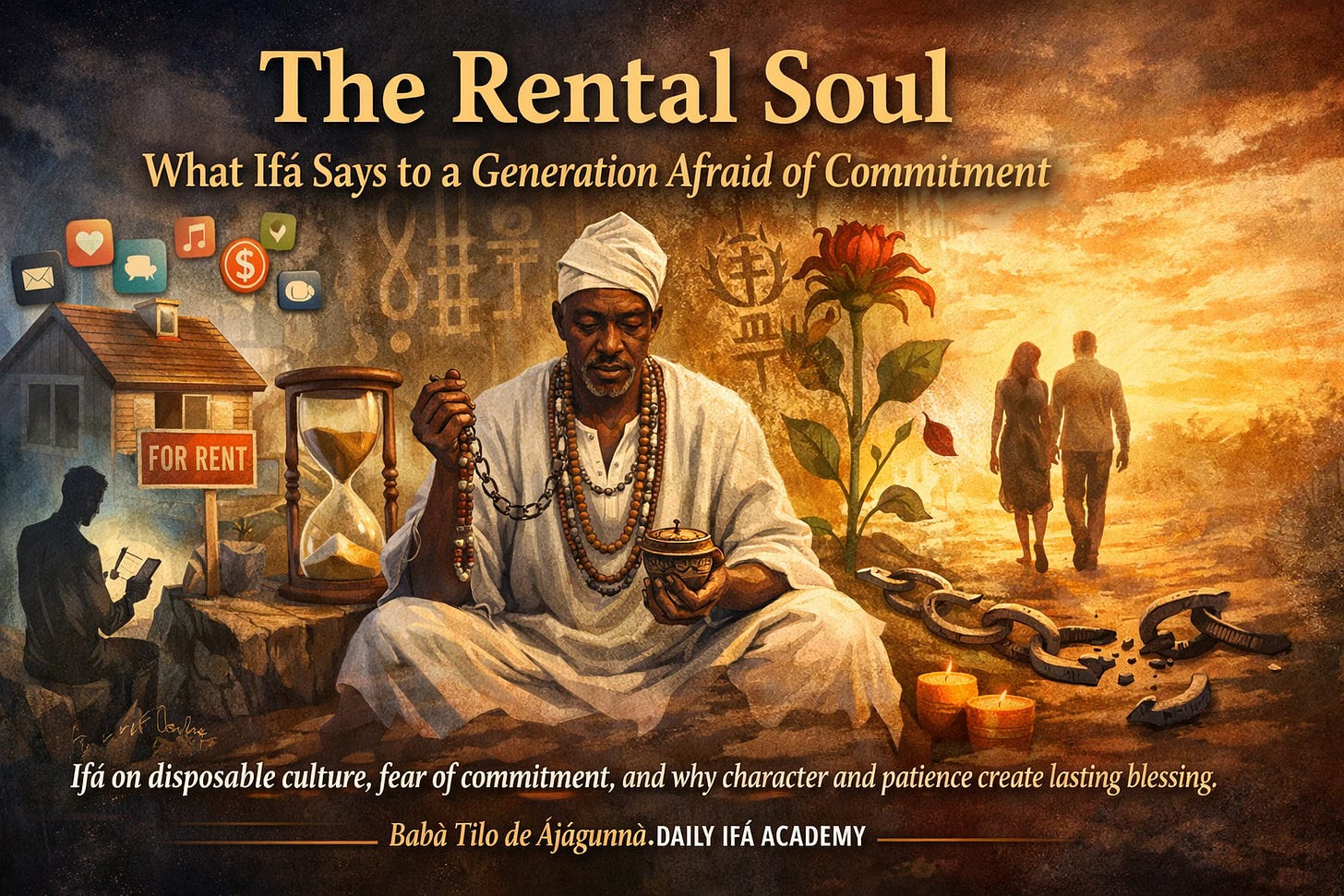 Yet Ifá is rarely impressed by what a culture praises most loudly. It asks what is being formed underneath the convenience. It asks what kind of human being is slowly emerging beneath the surface of habit. That is where the real question begins, because a social arrangement can remain outside a person only for so long. Eventually it enters the character. Eventually it becomes a way of feeling, choosing, desiring, and relating. And that is why the modern logic of temporary access cannot be dismissed as merely economic or technological. It has become moral, emotional, and spiritual.